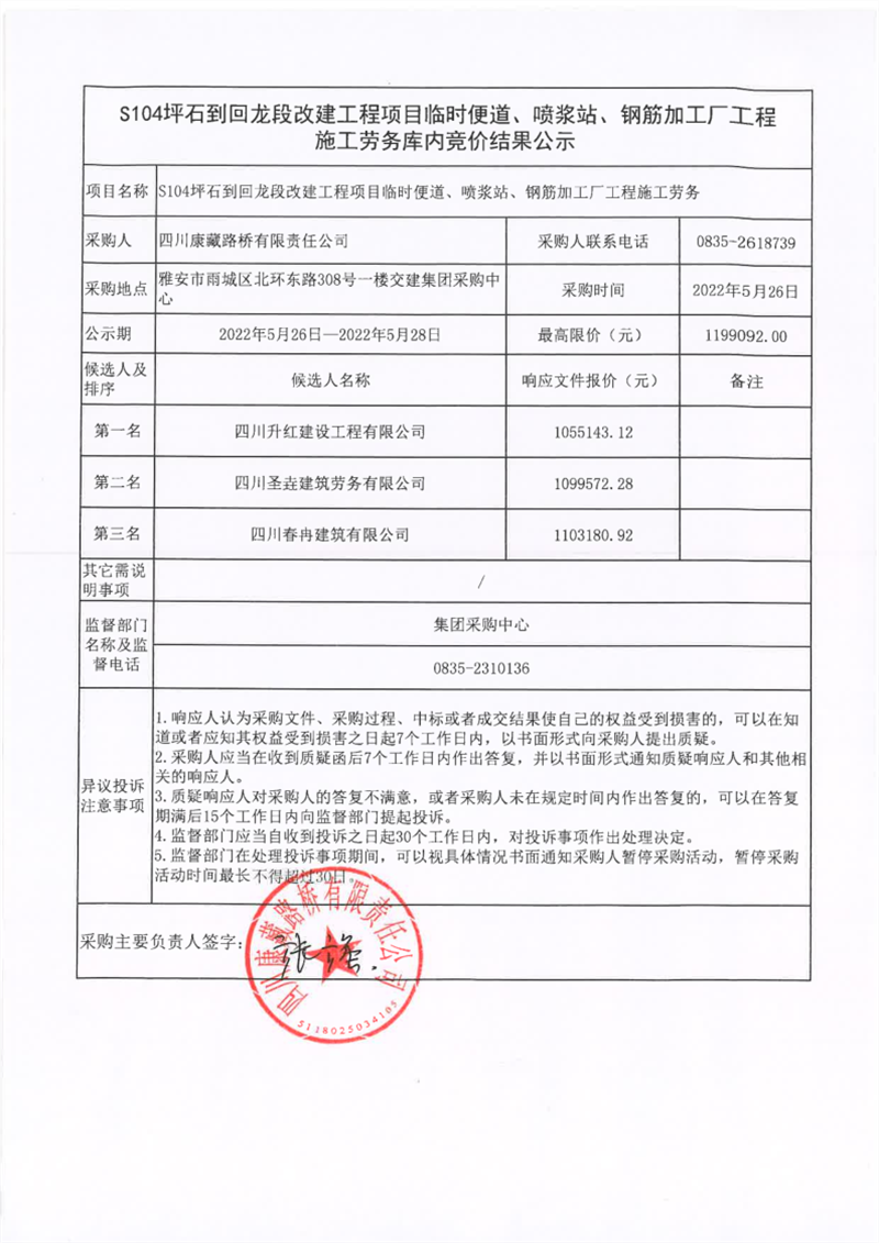 四川康藏路橋有限責任公司S104坪石到回龍改建工程項目臨時便道、噴漿站、鋼筋加工廠工程施工勞務庫內(nèi)競價結果公示